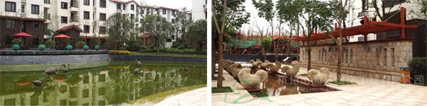 在紫荊東郡小區(qū),水景隨處可見,從主入口兩側近50米的景觀橋水景,到入口正前方一個大型的石雕噴泉,再到小區(qū)里面幾條主干道交匯的十字路口的小型地面噴泉,中心水景上的圓形石雕噴泉,特別是不遠處的動物噴泉雕塑,只只鶴低頭凝思,細長的水流從鼻端的出水口處流出,落入下方的水池里,更是格外引人注目?!斑@些水景小品具有的藝術特性與審美效果,加強了整個景觀環(huán)境的藝術氛圍,成為讓空間環(huán)境生動起來的關鍵因素,在提高小區(qū)藝術品質和景觀形象的同時,更給人們帶來美的享受?!睏罱?jīng)理如是說。