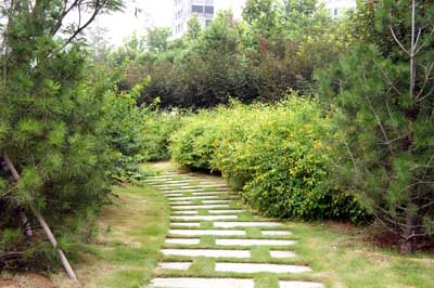 每個景觀節(jié)點上,植物的配置方法都是不一樣的,如在下沉廣場,主要是以小龍柏、金葉女貞等小灌木片植成方形或弧形,間或點綴石楠、梅樹,看起來規(guī)整、簡潔;而在設(shè)計風(fēng)格為江南園林的南廣場上,是將貴重的造型油松單植,通過不同的組合,形成三個風(fēng)格相近的綠島,周邊種植美人蕉、玉簪、竹子,并砌起白墻,上面開圓形拱門或圓窗,散發(fā)出詩意江南的靜謐和婉約氣息?!坝雾降朗秦灤┱麄€景觀的軸線,為了形成曲徑通幽的景觀效果,我們將對植、孤植、叢植都多種方法結(jié)合運(yùn)用,特別是在三叉路口,多種植海棠、櫻花、杏花等,一方面,花開的時候,綠葉間繁花點點,會吸引人們不斷向前探尋更多的美景;而花落之后,茂密的枝葉又形成隱隱約約的視覺感受,前方轉(zhuǎn)過彎后風(fēng)景什么樣,又讓人很想去看看?!备呓?jīng)理笑著說。