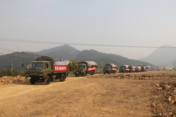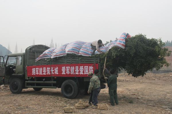 下午3點50分,八輛一字排開的軍車全部裝上了苗木,并進(jìn)行了仔細(xì)的遮蓋和捆綁。隨后,在噼噼叭叭的鞭炮歡送聲中,車輛徐徐開出基地,向舟山方向駛?cè)ァ?/p>