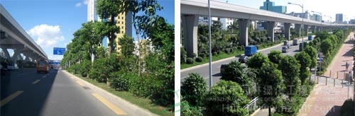如今,開車行進在這條道路上,干凈整潔的路面、開闊通透的視野、清新自然的景觀,給人帶來閑適、愜意的感覺?!耙匀藶楸?,尊重自然”的綠化理念,體現(xiàn)在景觀中的每個細節(jié);自然環(huán)境與城市環(huán)境的密切結(jié)合,使高架橋的道路通行功能與橋下中央綠化帶的生態(tài)功能有機融合。整條道路,不僅體顯出深圳這個濱海大都市獨有的景觀特色,更彰顯出這個城市的生機活力與熱情奔放。