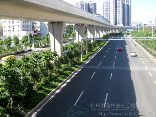 該工程最大的特色和亮點為:“以人為本,尊重自然”、“ 處處有綠葉,無處不飛花”等自然生態(tài)的設(shè)計理念貫穿始終;中央綠化帶位于高架橋下,長勢茂盛的各類植物形成一條繽紛絢麗的彩帶擁簇著高架橋段,使整條橋段與綠化景觀有機融合。2012年,該工程榮獲中國風(fēng)景園林學(xué)會“優(yōu)秀園林綠化工程金獎”。