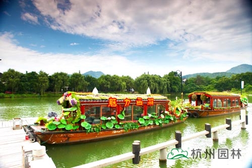 藝術(shù)節(jié)期間,首次在西湖湖面上配置6艘荷花花船,極大地提高了荷花節(jié)的觀賞性和趣味性,成為西湖中一道流動(dòng)的荷花美景。其中,由杭州市園林綠化股份有限公司設(shè)計(jì)制作的“魅力西湖”荷花游船,將插花技藝與園林布景手法有機(jī)結(jié)合,用康乃馨、勿忘我、太陽花等與荷花組景,既突顯了“主角”荷花的秀麗、典雅,又使整艘船的色彩明艷豐富,將熱鬧的節(jié)日氛圍巧妙烘托。