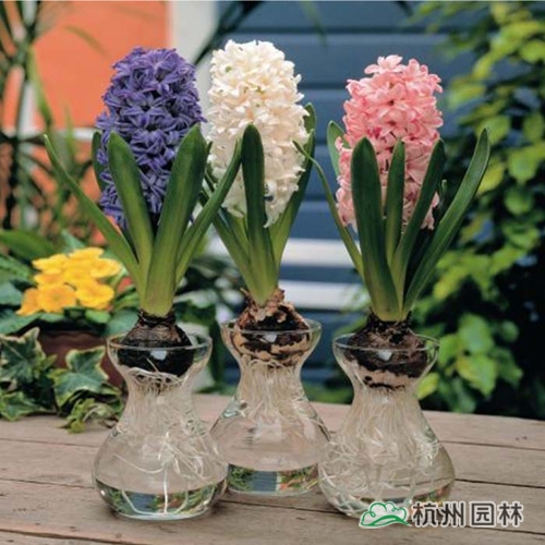 風(fēng)信子:目前市場(chǎng)上常見(jiàn)的風(fēng)信子有粉、藍(lán)、玫紅、紫、白等品種,其中以藍(lán)、粉、紫最受歡迎。選購(gòu)時(shí)要挑個(gè)頭大而飽滿(mǎn)的,抓在手上硬實(shí)偏重,根部不發(fā)霉,生長(zhǎng)點(diǎn)未受破壞的種球。11月下旬種植,在陰冷的環(huán)境下放置兩個(gè)月左右,這樣處理可以減少后期夾箭的概率,也有利于根系的生長(zhǎng),待花芽長(zhǎng)至5cm左右時(shí)移至光線充足的區(qū)域即可。風(fēng)信子也可水培,但較盆栽一般花箭短、花朵少,花期也會(huì)短一周左右。