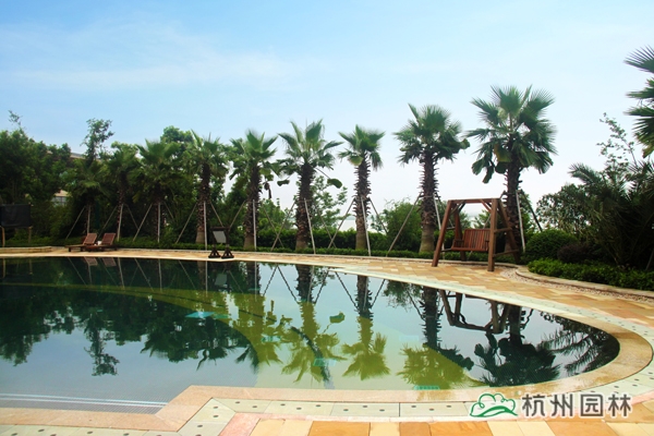 露天泳池區(qū)景觀獨具特色,選用華棕、棕櫚、布迪椰子、加拿利海棗等熱帶植物作為主景,營造出簡約大方、層次分明的濃郁熱帶園林風(fēng)情。為了提高這些熱帶植物的成活率,降低后期的養(yǎng)護成本,這批植物都經(jīng)過馴化,較能適應(yīng)吳江的氣候條件。該區(qū)面積較大,從酒店的觀景平臺上往下看,泳池中間的小島就像彎彎的小船,仿佛要順流而下;水質(zhì)清澈見底,水底大面積的藍色和黃色玻璃馬賽克,營造出波光鱗鱗的效果,偶有微風(fēng)吹來,水面蕩起陣陣漣漪,流動的線條瞬間充滿了生機和活力,整個泳池仿佛都動了起來。岸邊的植物高大茂密,郁郁蔥蔥,透過樹叢的間隙,浩渺無邊的太湖水系與遠處的天際線連接在一起,恍然之間,好象是來到了充滿陽光、海浪、沙灘的南國熱帶海域,心情的舒暢不言自喻。