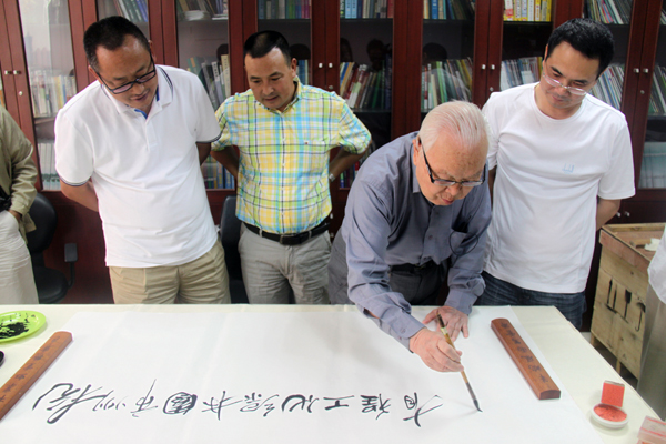 孫老不僅是一位園林規(guī)劃設(shè)計專家,同時也是一位書畫名家,他曾師從徐悲鴻、孫多慈教授學(xué)畫,具有很高的藝術(shù)修養(yǎng)。在我們的邀請下,孫老欣然提筆,寫下了“杭州市園林綠化工程有限公司”、“易大景觀”等公司名稱,以及“天然圖畫”、“造化為師”等題詞,以精準(zhǔn)的語言凝煉了他對園林行業(yè)的看法,寥寥數(shù)語中,讓我們深受啟發(fā)。行云流水的筆法、流暢飽滿的線條,每一幅題字都一氣呵成,每一幅題字都是一幅藝術(shù)畫。每幅題字寫完,大家都會報以熱烈的掌聲,孫老對園林的深刻見解及深厚的書法功底令我們深深折服。